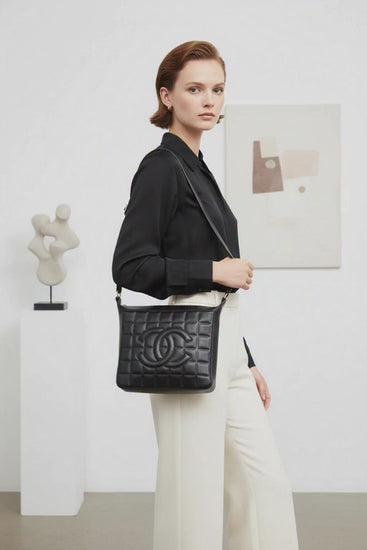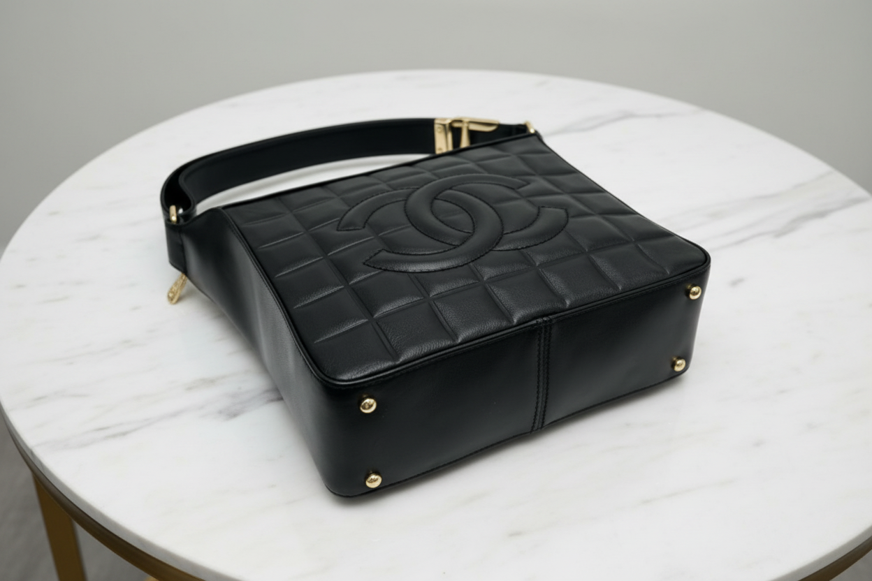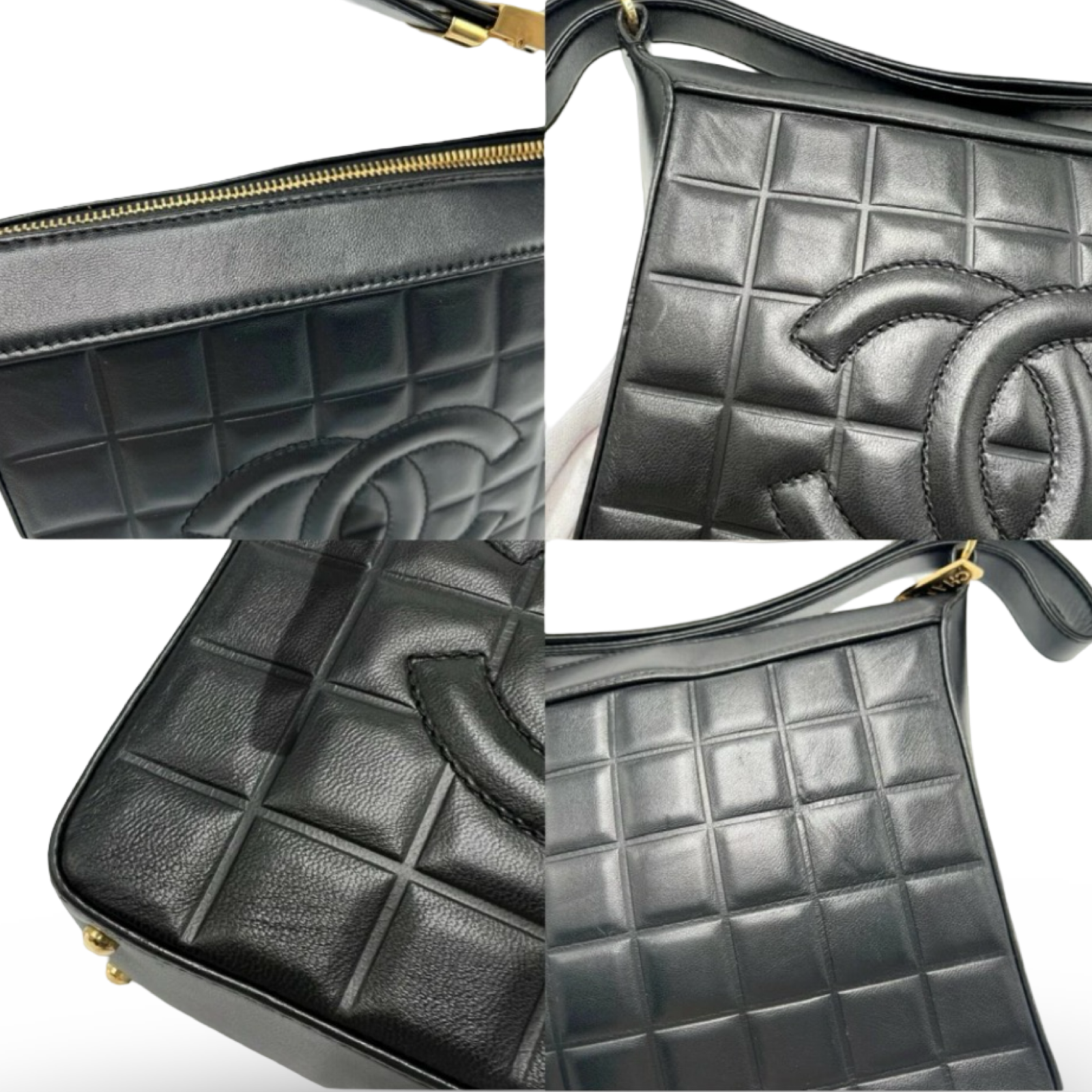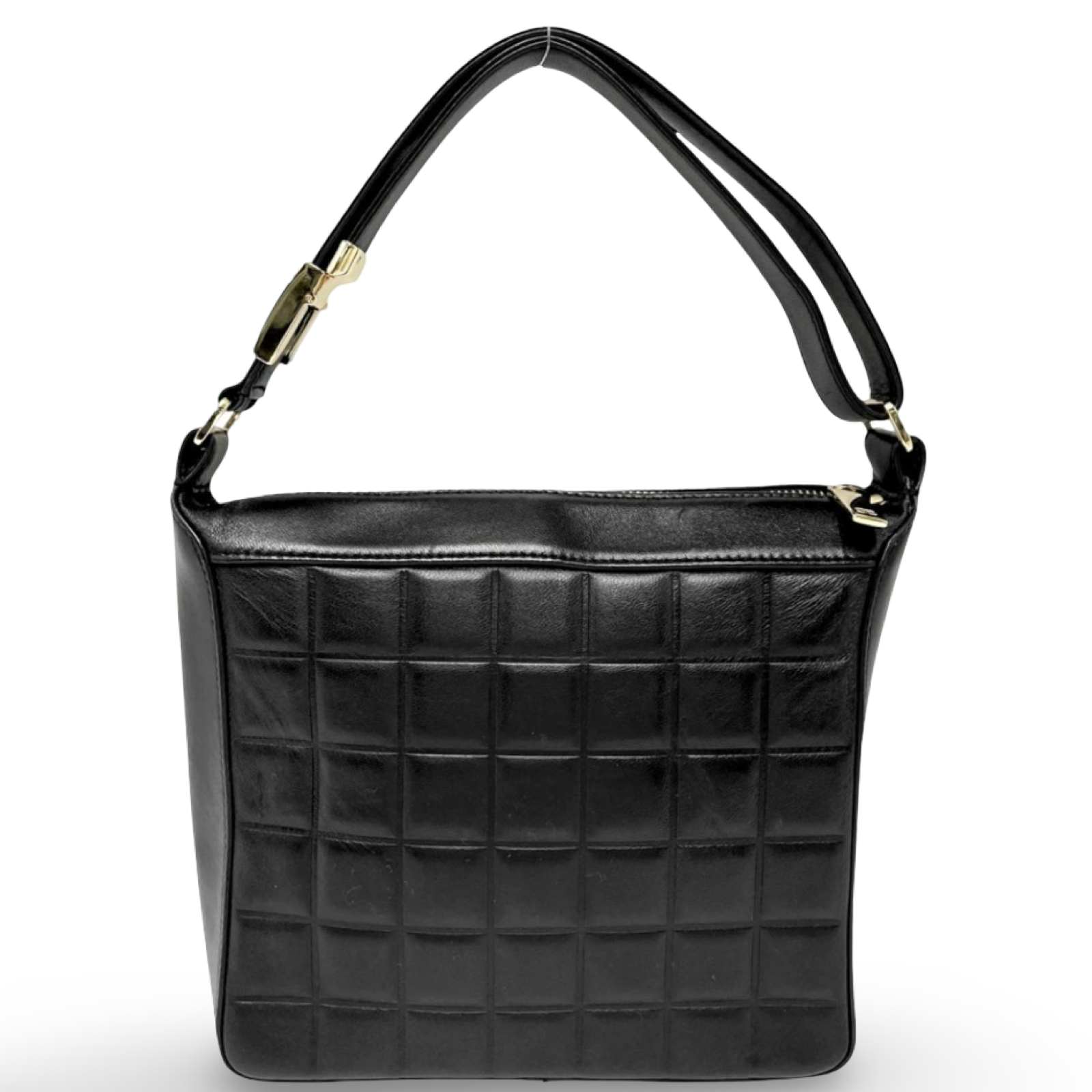 The Chanel Chocobar Coco Mark semi-shoulder bag showcases one of Chanel’s iconic early-2000s designs. Crafted in smooth black leather with the distinctive Chocobar quilted grid pattern, the bag features a bold embossed CC logo on the front and elegant gold-tone hardware. Its sleek silhouette and adjustable shoulder strap make it a refined everyday piece while maintaining the timeless sophistication associated with Chanel.