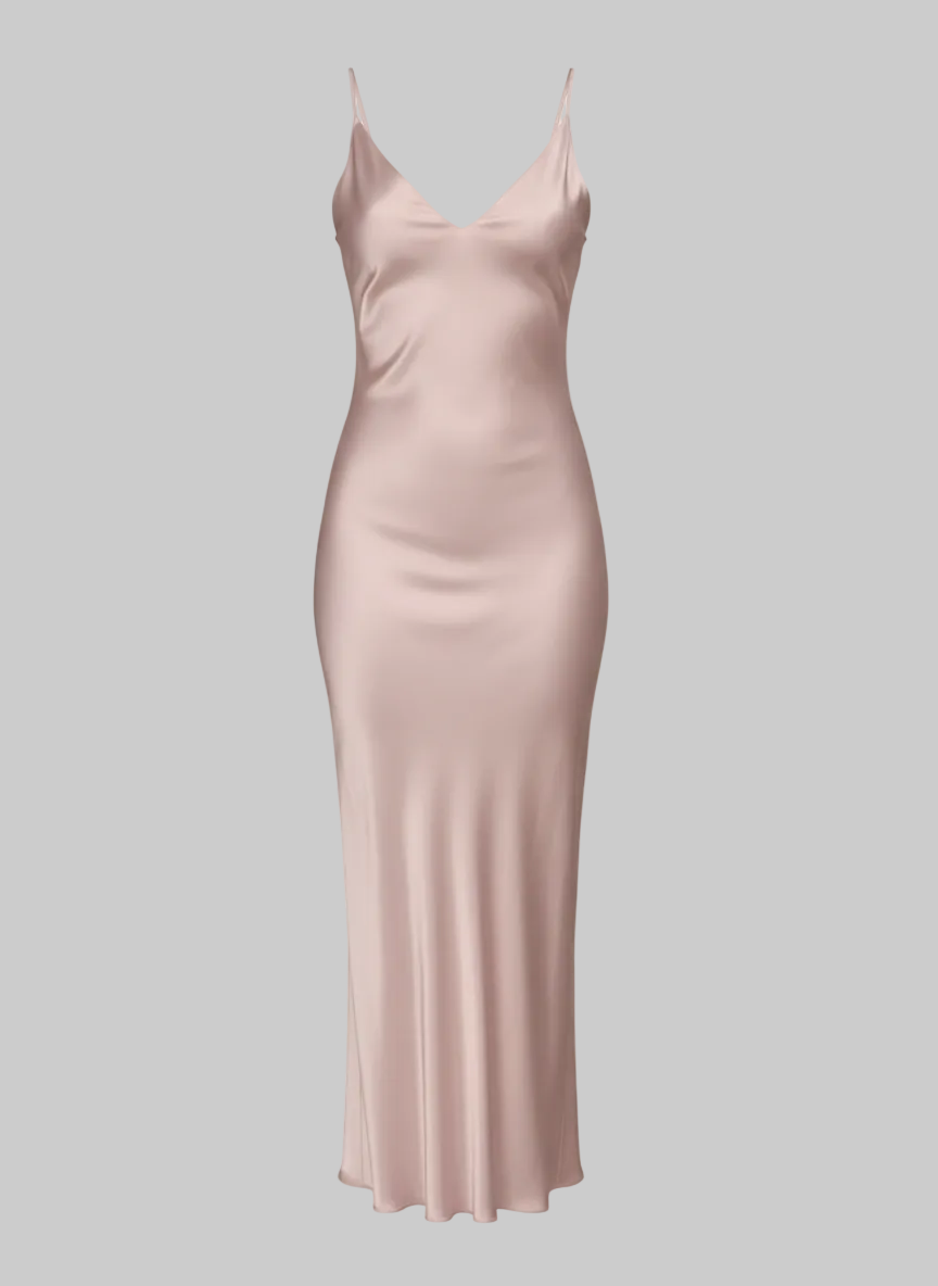 An effortlessly polished two-piece outfit featuring a silky slip dress paired with a relaxed knit V-neck sweater.