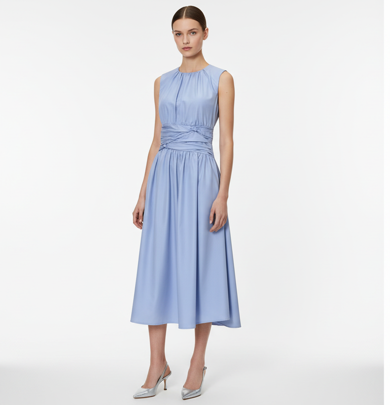 Clean, polished, and easy to wear, this sleeveless blue midi dress features a softly gathered bodice, a defined ruched waist, and a flattering A-line silhouette.