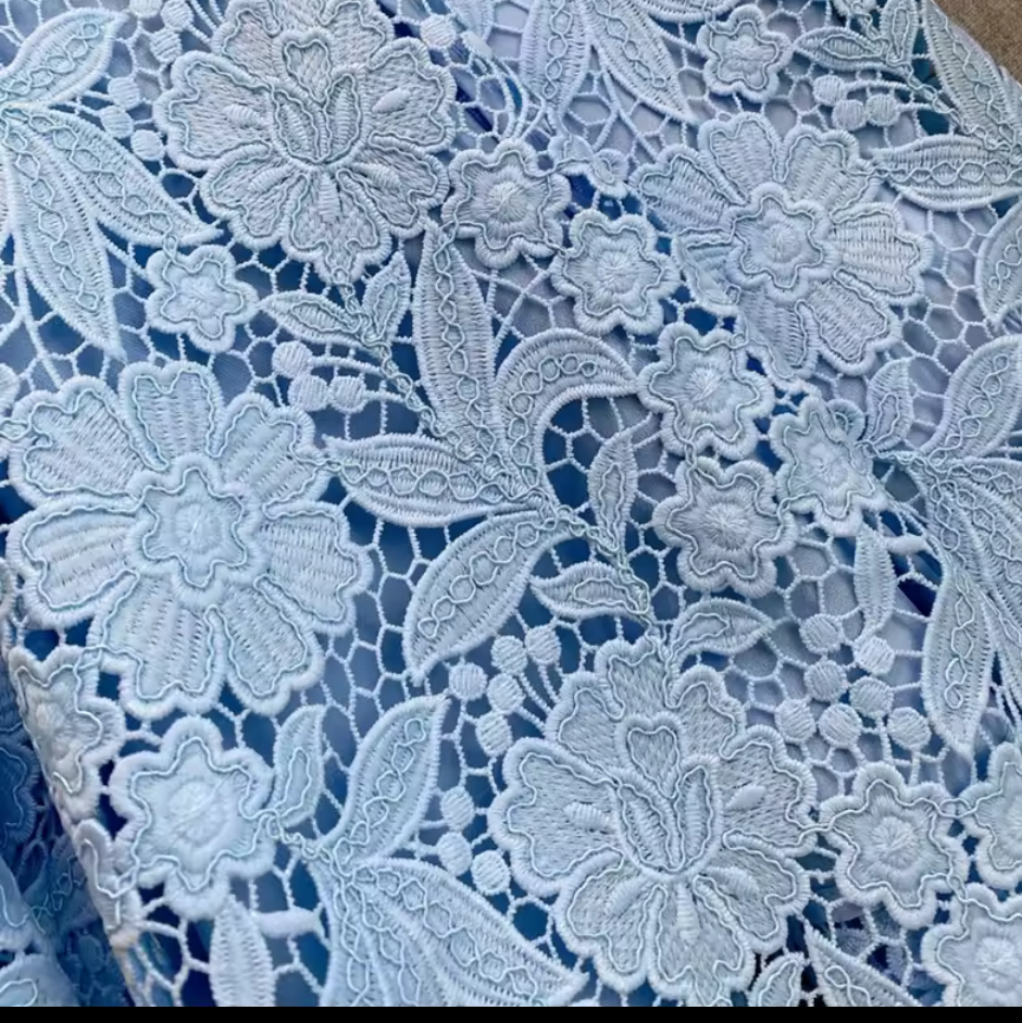 A soft sky blue tone with a matching floral lace skirt panel and a jewel-embellished neckline for a polished, feminine finish.