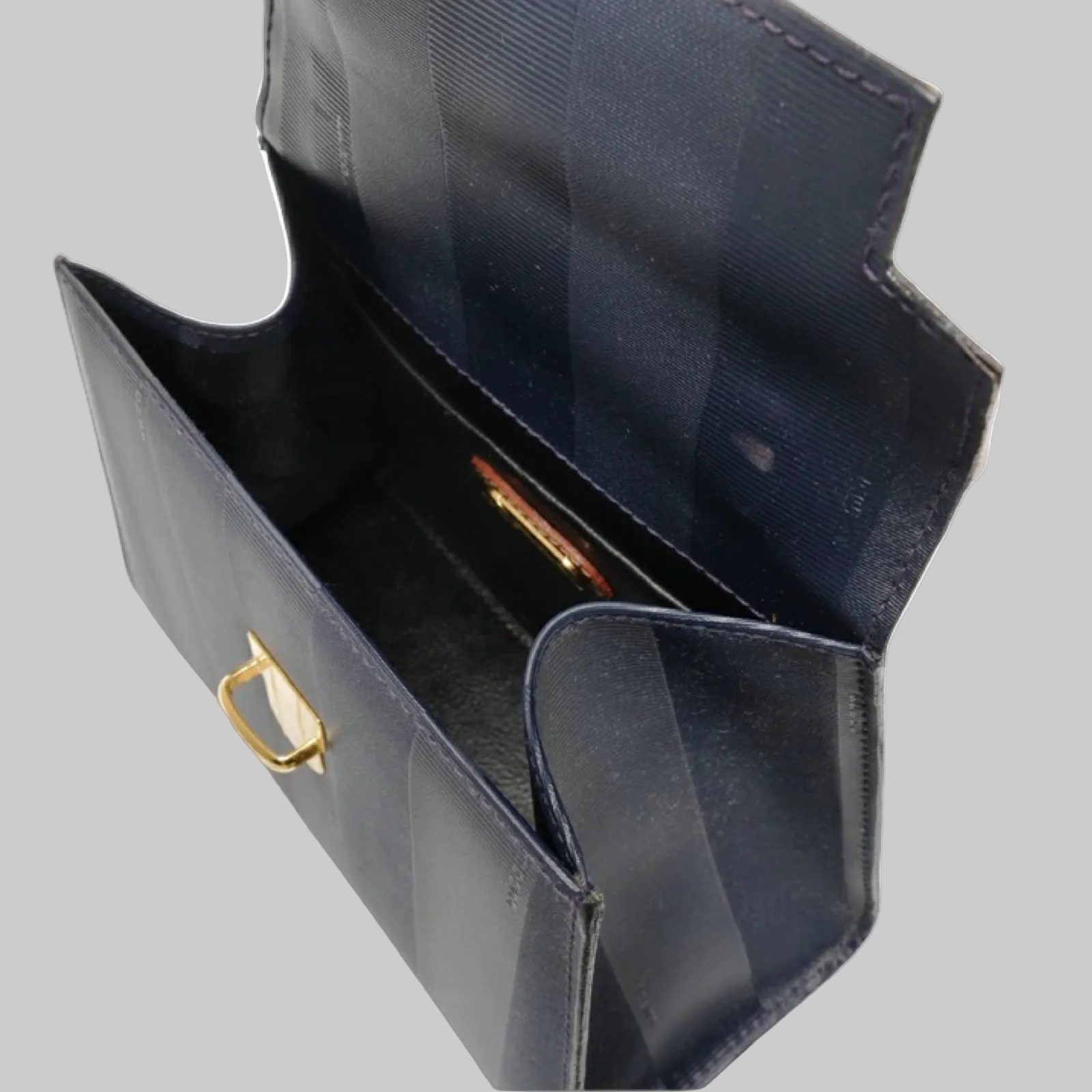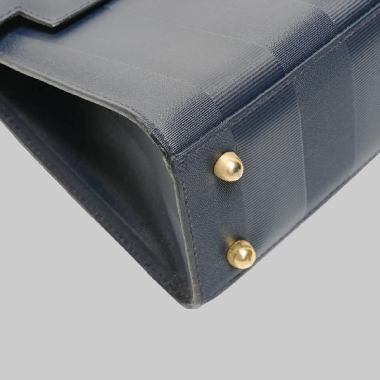 A structured vintage-inspired Fendi Pequin 2-way handbag crafted in navy PVC with the house’s iconic striped motif and warm tan leather trim.