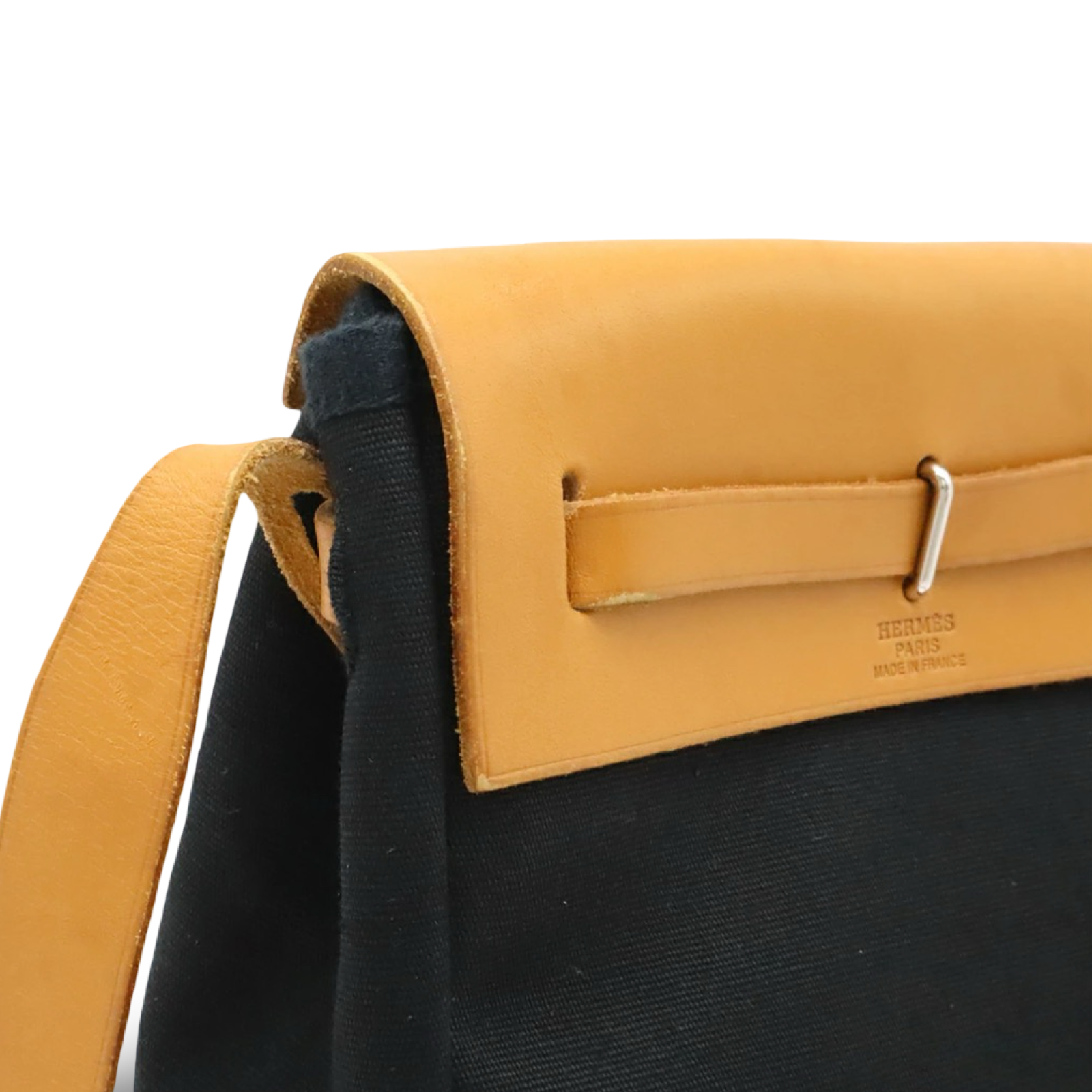 A rare and distinctive Hermès Toile Officier TPM shoulder bag crafted in a combination of leather and signature toile canvas. This compact silhouette is finished in classic black and natural tones with the H stamp, offering a refined vintage Hermès look with practical everyday versatility. The included replacement pouch adds extra function for organization and storage.