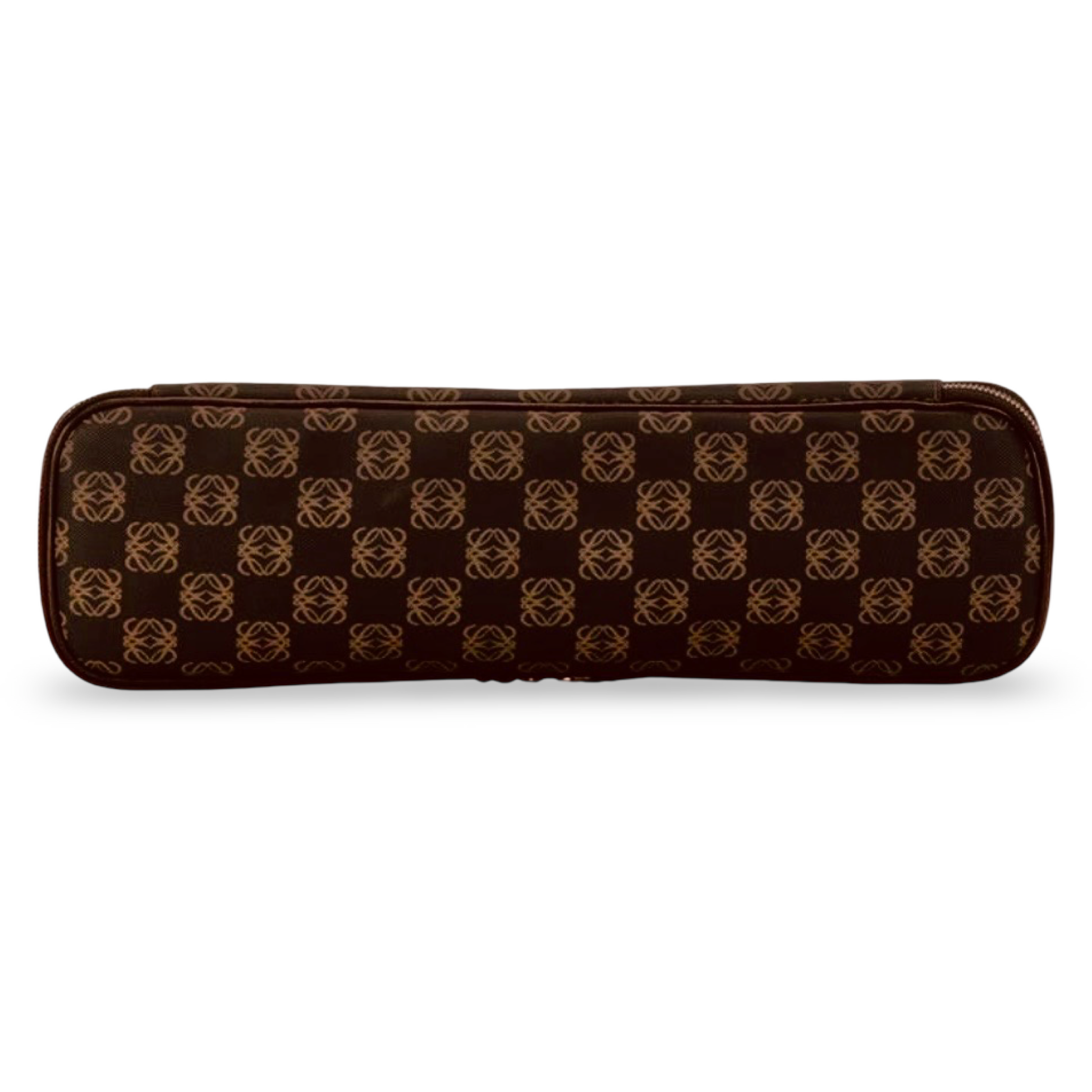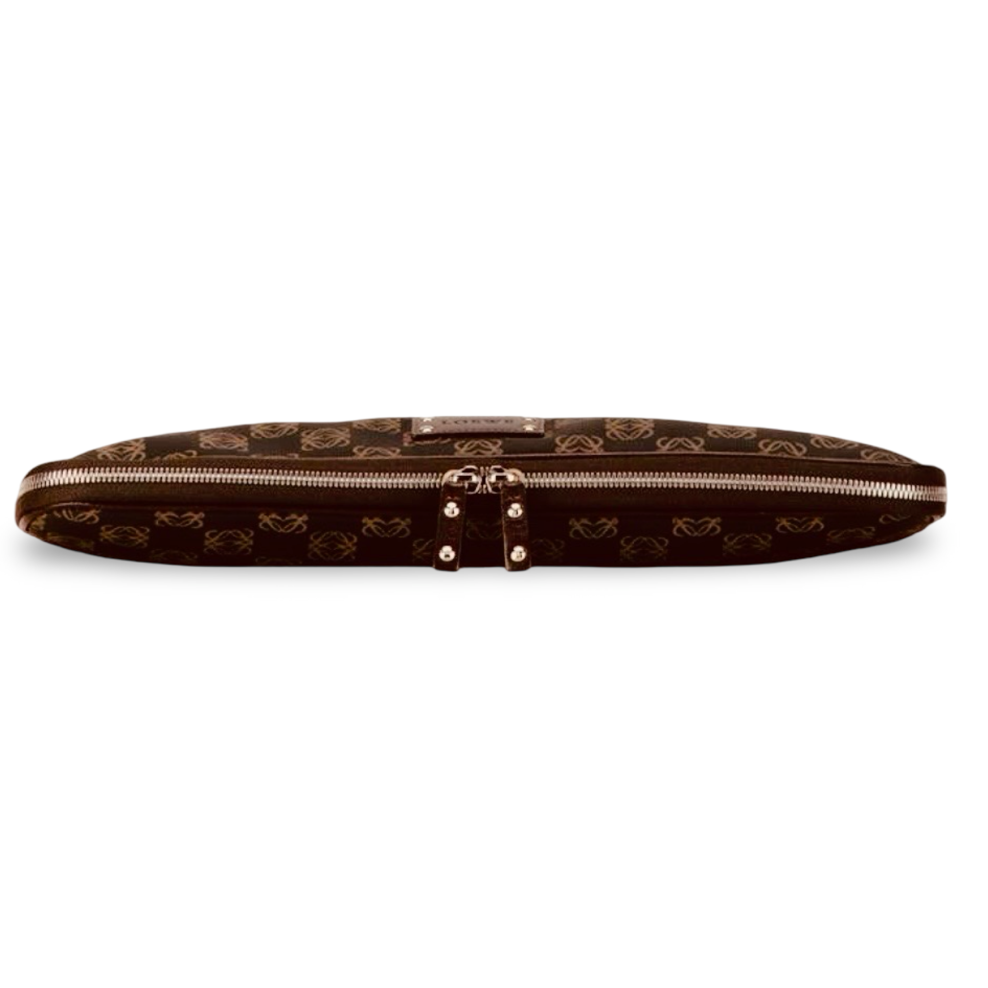 Loewe Anagram Clutch Pouch crafted in signature Anagram patterned PVC with leather trim in a black and brown color combination. This compact Loewe pouch features the recognizable repeating Anagram motif and a slim structured silhouette ideal for everyday essentials.