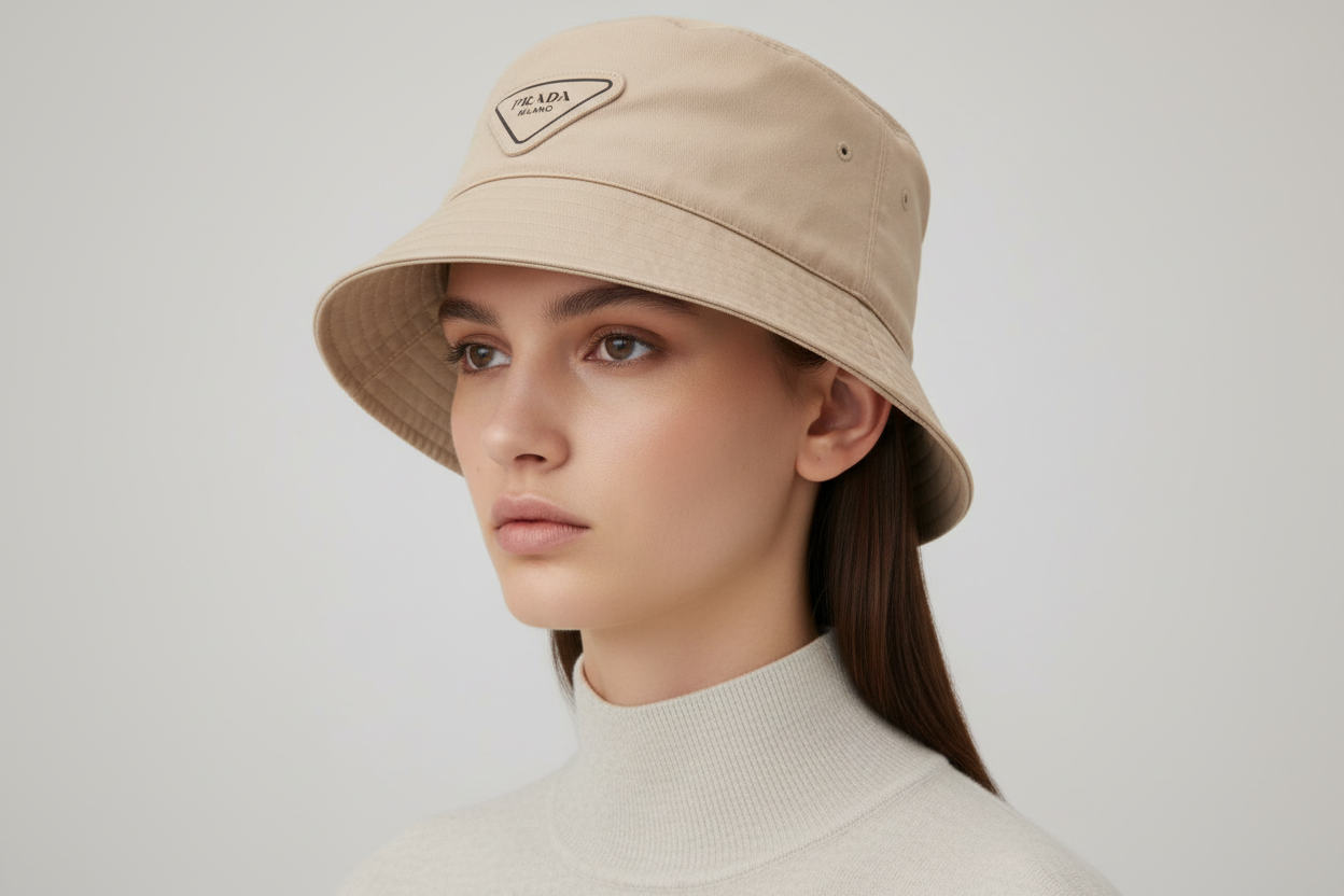 The Prada Logo Bucket Hat is a modern luxury accessory crafted in soft cotton with the iconic enamel-style Prada Milano triangle logo patch on the front. Its clean beige tone and classic bucket silhouette make it an effortless everyday piece that pairs well with both casual and elevated styling.