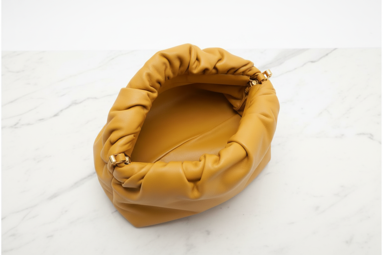 The iconic Bottega Veneta The Chain Pouch crafted from soft Curry (Mustard Yellow) leather and finished with a bold oversized gold-tone chain strap. Known for its sculptural silhouette and minimalist luxury aesthetic, this piece reflects the modern design language introduced during Daniel Lee’s era at Bottega Veneta.