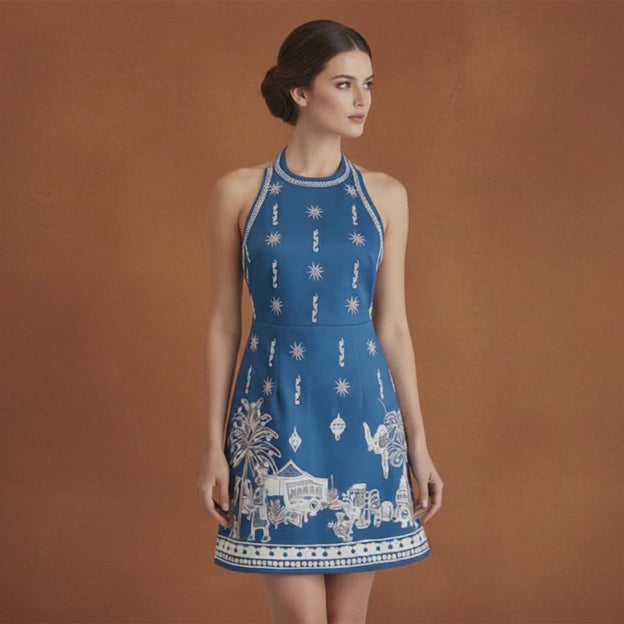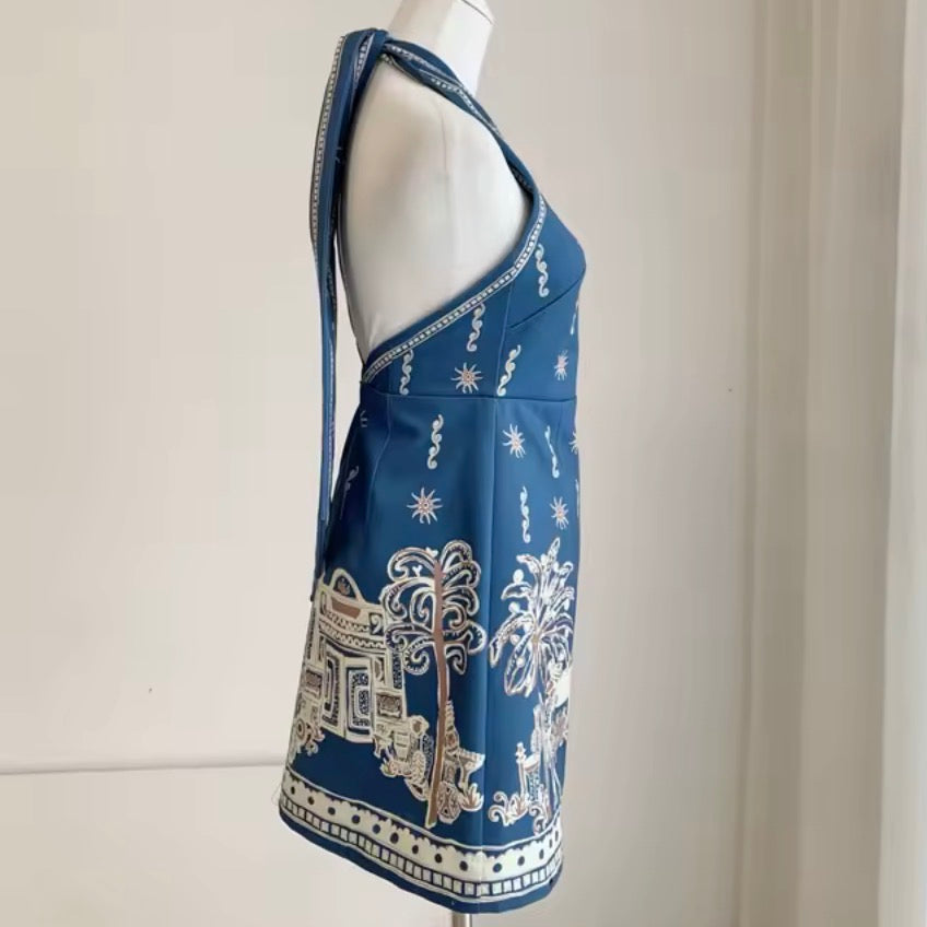 A striking mini dress designed with an artful blue coconut tree print and a fresh resort-inspired silhouette. This halter style combines a fitted shape with an open back detail, creating a bold yet polished look for warm-weather dressing.