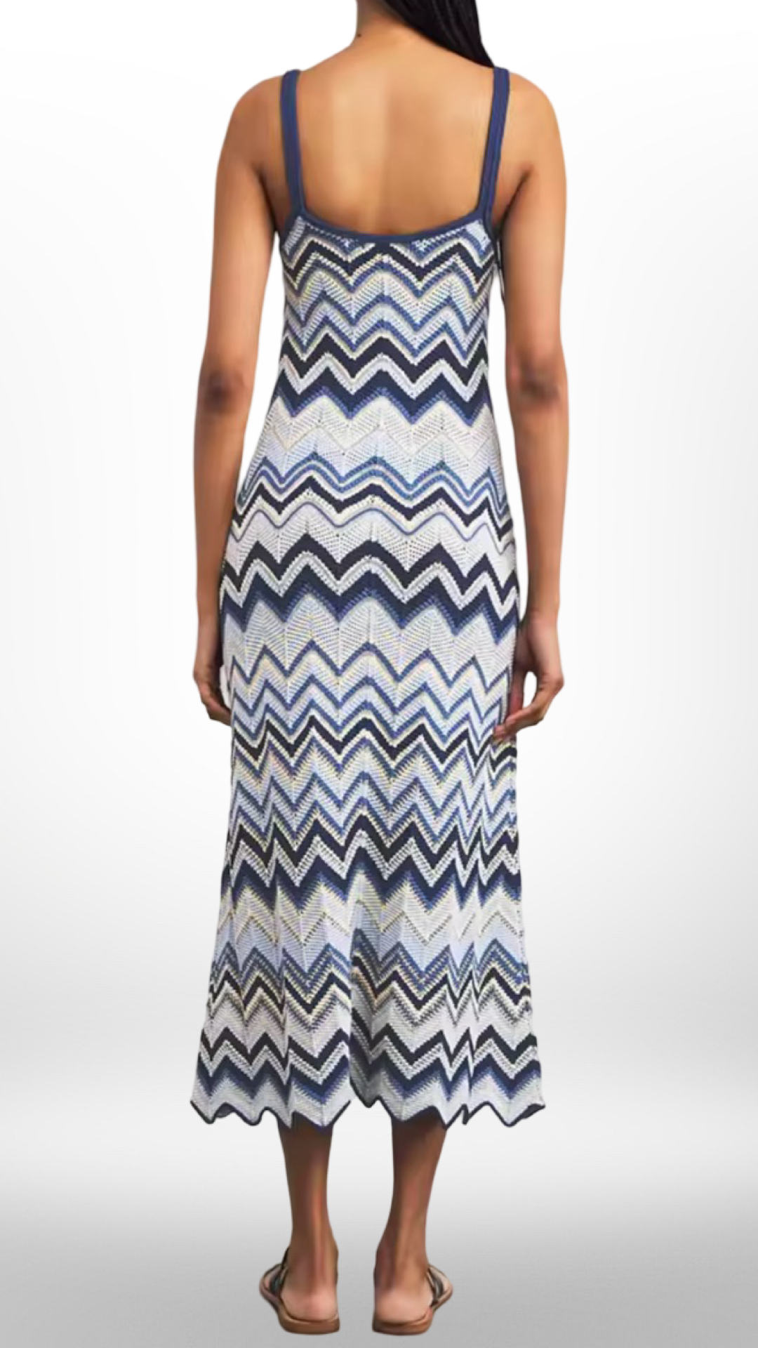 A chevron-knit maxi dress designed in a blue, navy and ivory zigzag pattern. The silhouette is long, fitted through the bodice, and softly flared toward the hem. Lightweight, breathable, and stretchy—perfect for beach vacations, summer evenings, and effortless resort styling.