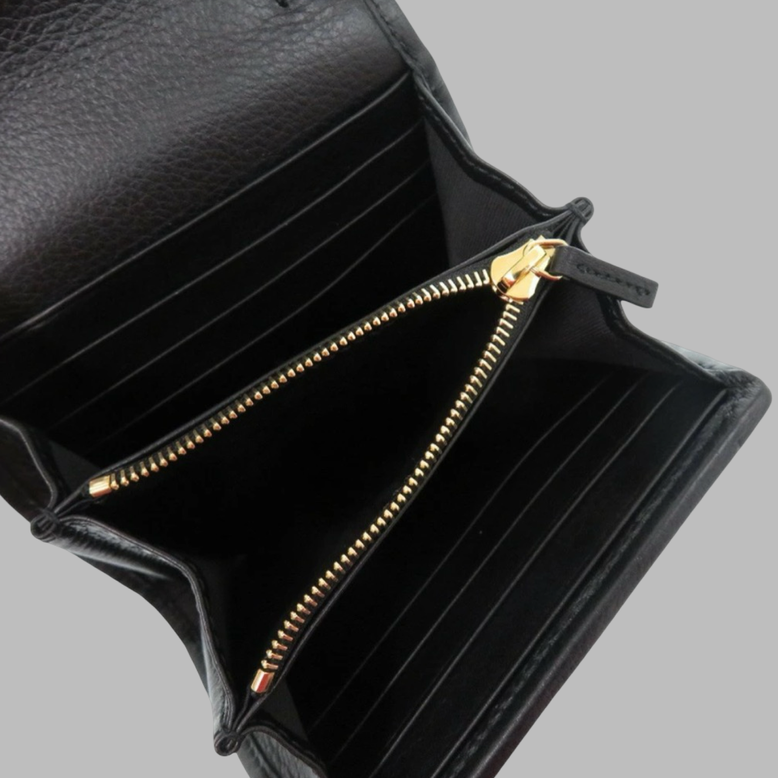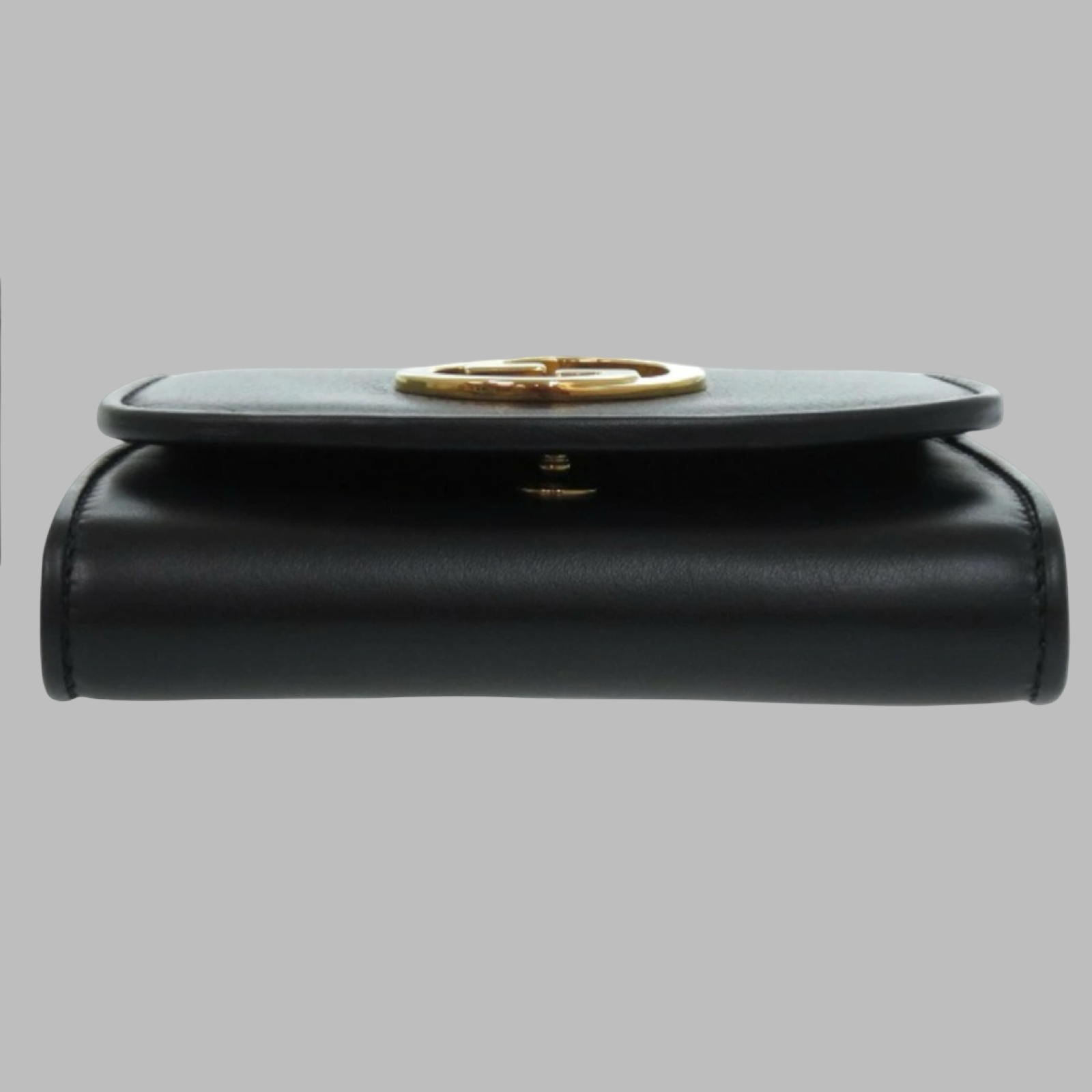 A compact and elegant Gucci Interlocking G Blondie Medium Chain Shoulder Wallet crafted in black leather with gold-tone hardware. This versatile piece functions beautifully as a wallet-on-chain, offering a polished day-to-evening look with signature Gucci styling.