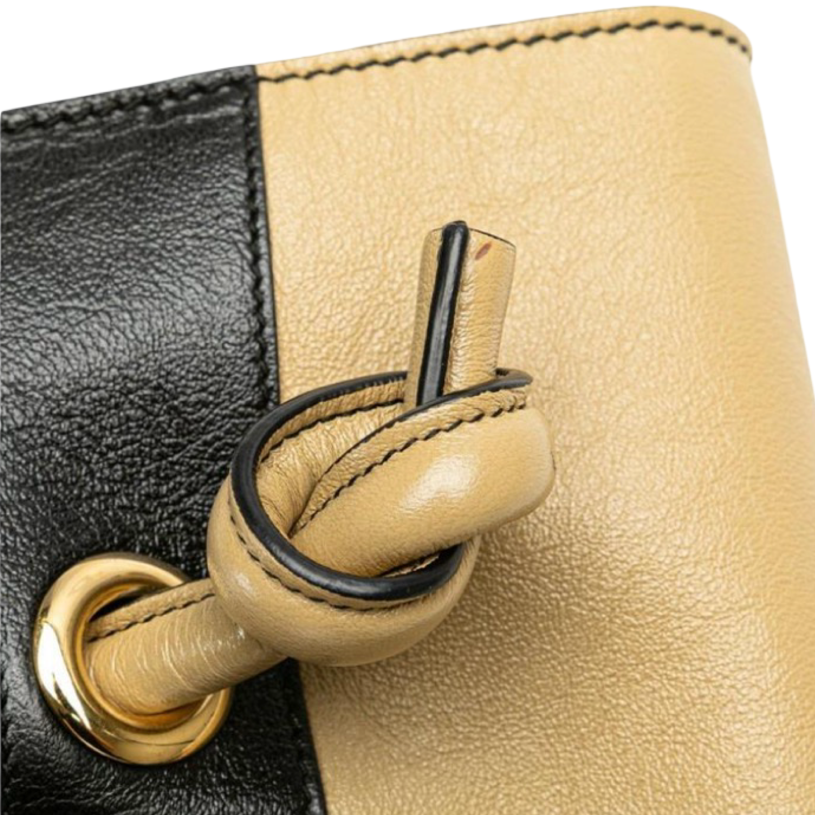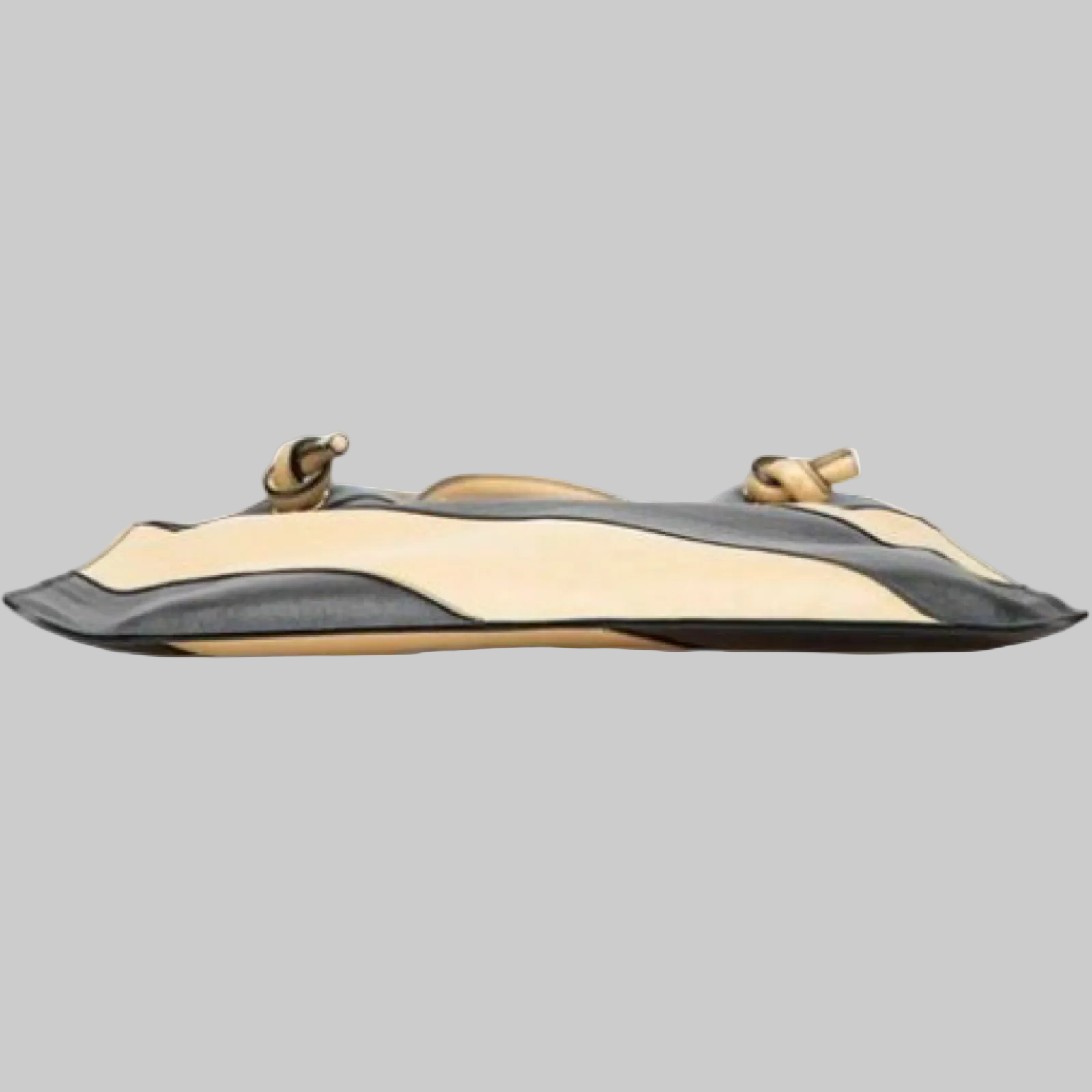 A structured and elegant Gucci Zumi Horsebit bicolor tote crafted in leather with a striking black and greige diagonal panel design.