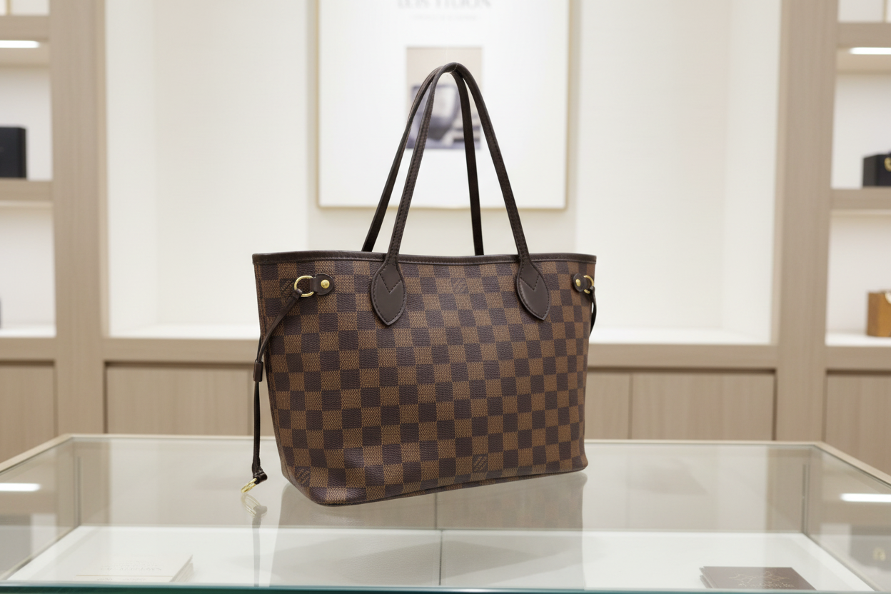 The iconic Louis Vuitton Neverfull PM in the timeless Damier Ebene canvas. This elegant tote features structured brown coated canvas with natural leather trim and gold-tone hardware. The spacious interior with signature red lining makes it perfect for everyday essentials while maintaining Louis Vuitton’s classic refined style.