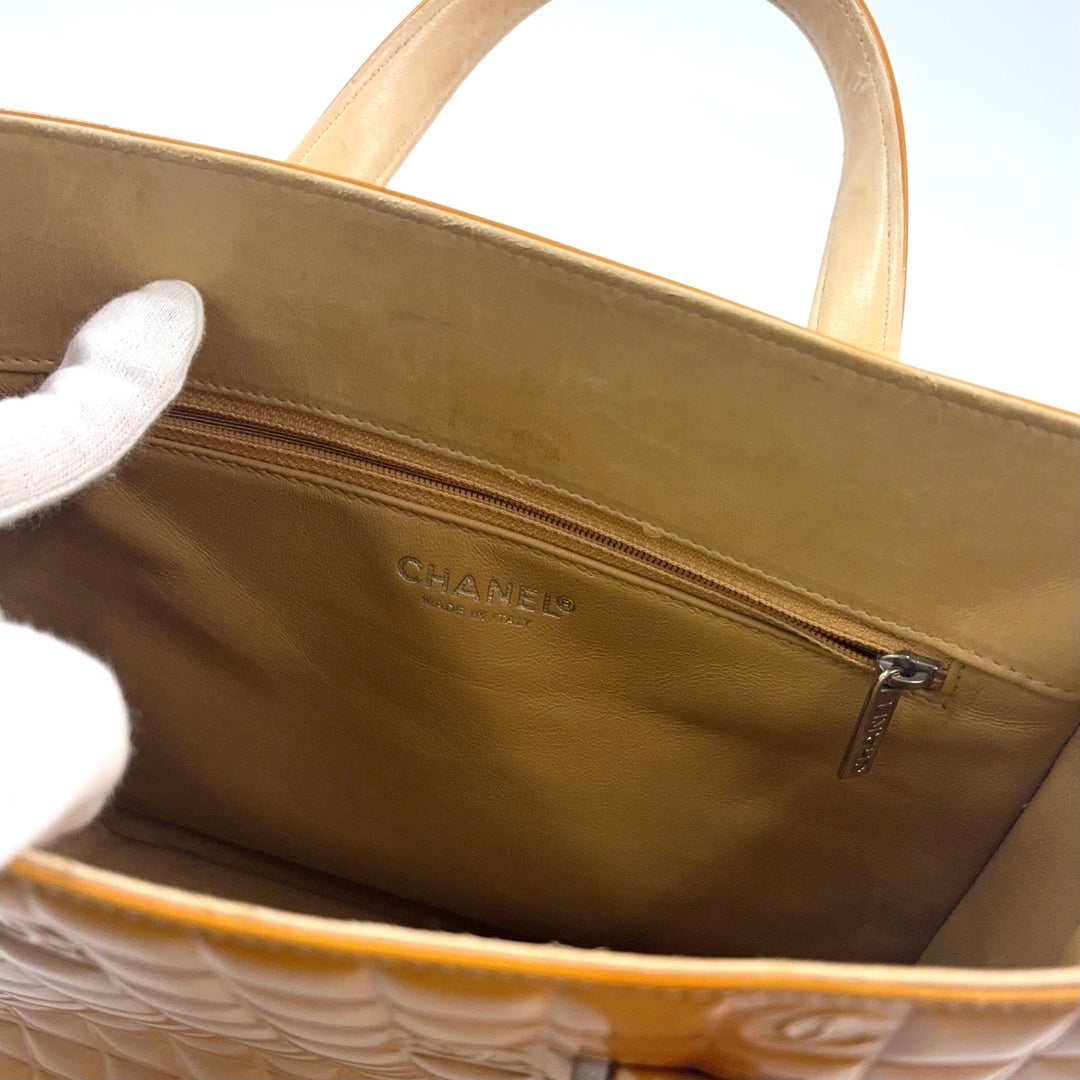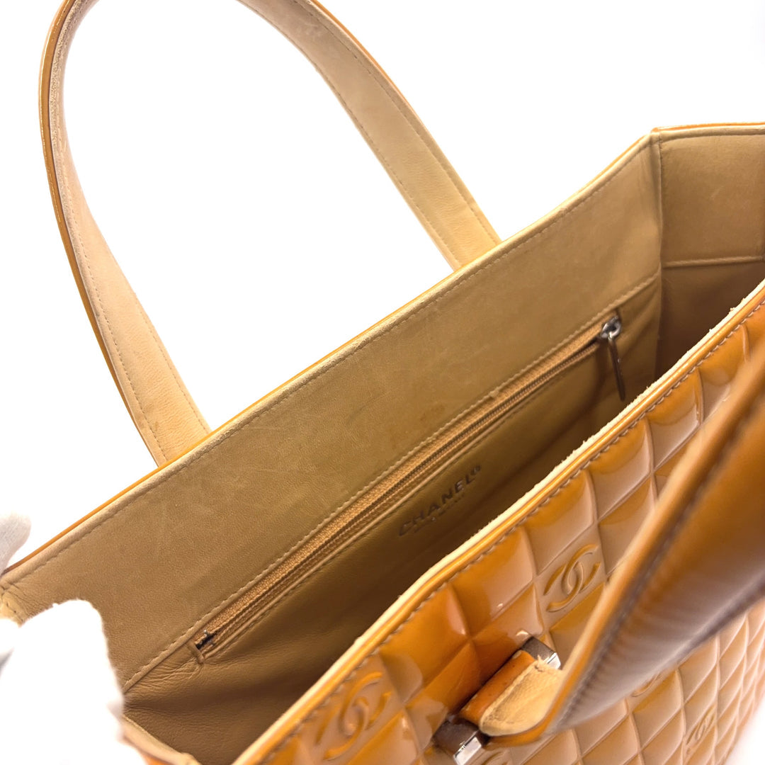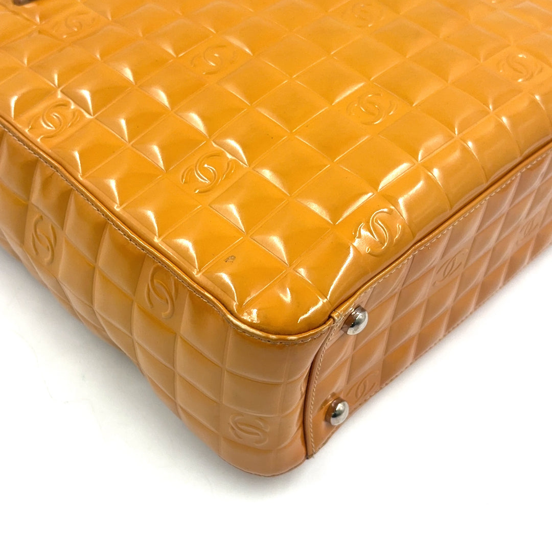 This authentic Chanel Chocolate Bar Coco Mark Tote Bag features the house’s signature square “chocolate bar” quilting with subtle CC motifs throughout. Crafted in glossy yellow patent leather with silver-tone hardware, it delivers a structured silhouette with top-handle carry and a bold color story.