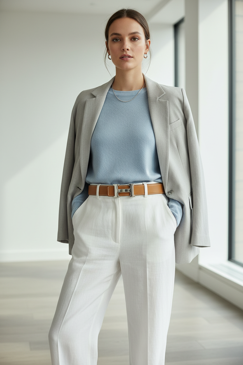 The iconic Hermès H Belt features the maison’s instantly recognizable H buckle paired with a refined reversible leather strap. Designed for versatility, this elegant accessory allows two color options in one piece — a warm light brown tone on one side and a soft light gray on the reverse.